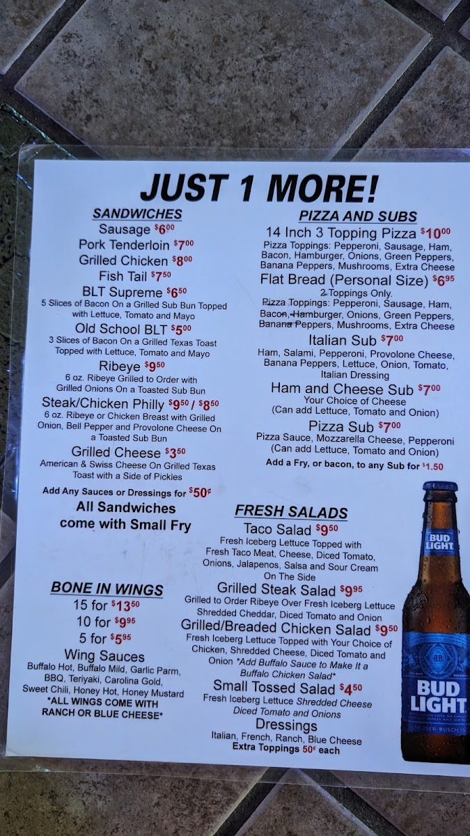 Just One More offers a straightforward bar and grill menu featuring casual, satisfying options that fit well with its relaxed neighborhood vibe. The menu brings together classic sandwiches like grilled chicken or a hearty pork tenderloin, alongside comforting favorites such as a three-topping pizza or a freshly made Italian sub. Fresh salads are also available, providing lighter choices that suit a variety of tastes.